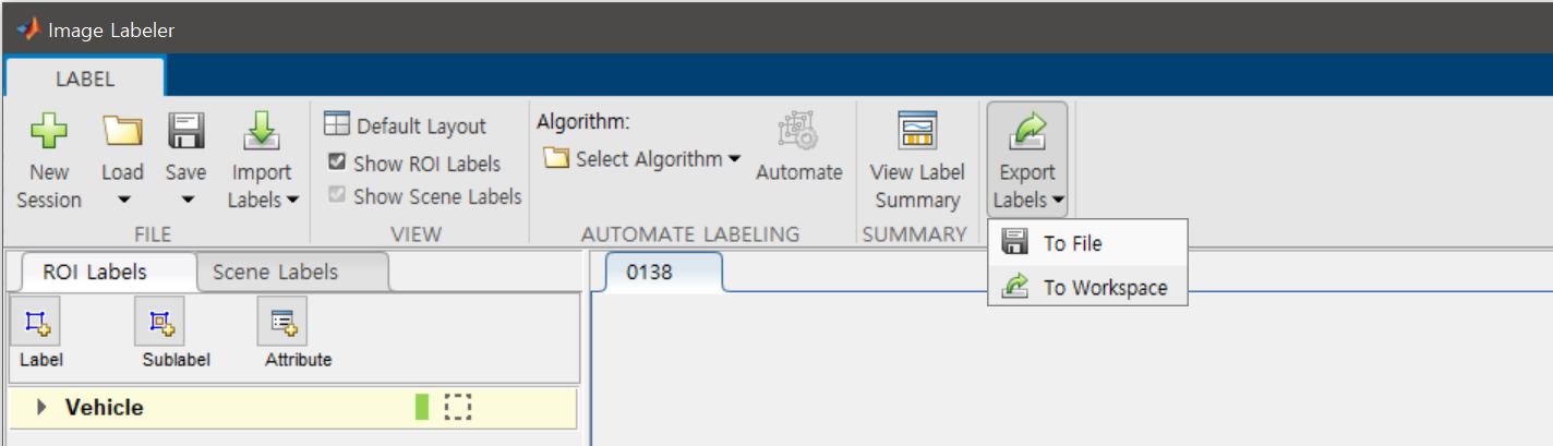 6. 라벨링이 모두 완료가 되면 Export Labels에서 추출해주시면 됩니다. 저는 한번 더 검증하기 위해 보통 To Workspace로 이동시킨다음 저장하는것을 선호합니다. 저장 방식은 Ground Truth 보단 Table 형태가 직관적입니다.