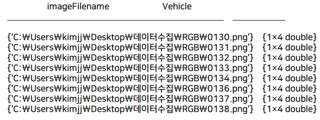 7. Table 형식으로 저장하게되면 다음과 같이 파일 경로와 객체의 경계상자 좌표값이 저장되게 됩니다. Matlab 내에서 학습을 진행하게 될경우, 바로 입력해주면 되며 다른 형식으로 변환 역시 간편하게 하실 수 있습니다. 라벨링이 진행 중인 상황정보를 저장할땐 Save에서 Session를 저장해주시면 됩니다.