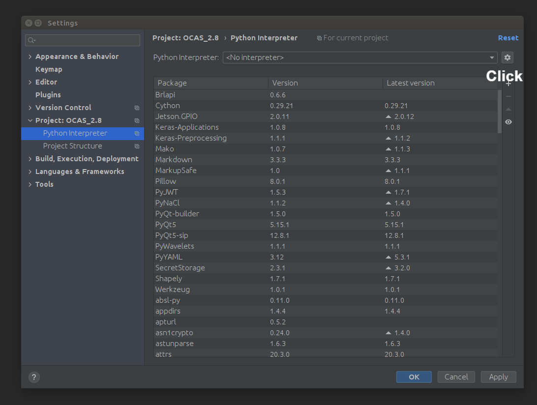 pycharm의 bin 폴터에서 터미널을 실행한 다음, ./ 명령어를 통해 파이참을 실행해줍니다. 1~2분의 로딩 후 정상적으로 실행되는것을 보실 수 있습니다. 이제 작업이 되는 파이썬과 연결해주기 위해 좌측 상단의 File -> Settings를 클릭한 다음, Project 탭에서 우측 상단의 설정 -> Add를 눌러주세요.