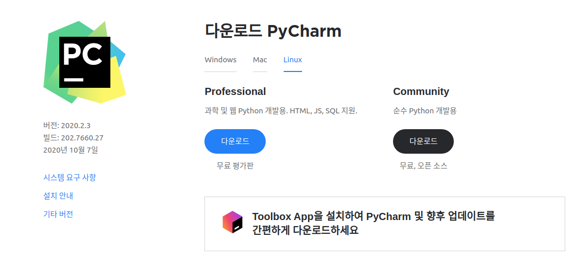 www.jetbrains.com/ko-kr/pycharm/download/#section=linux