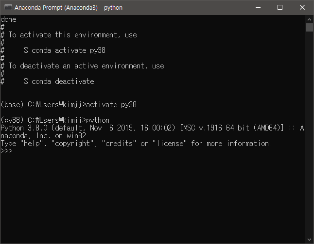 모든 설치가 완료되면 활성화 명령어로 가상 환경에 접근합니다. python을 입력해서 정상적으로 python 버전이 맞게 실행되는지 확인합니다. 오류없이 실행되었다면 기본적인 가상환경 구축은 모두 완료됩니다.
