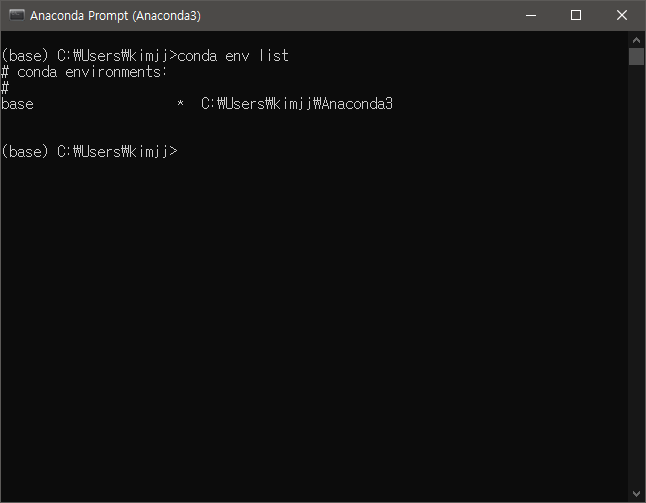 현재 구축된 가상 환경을 검색하는 명령어를 입력해줍니다. 아직 별도의 가상환경을 생성하지 않았기 때문에 base 환경만 리스트에 나오게 됩니다. 콘솔 창에서 복사+불어넣기는 shift + ins 키를 눌러주거나 마우스 우클릭입니다.