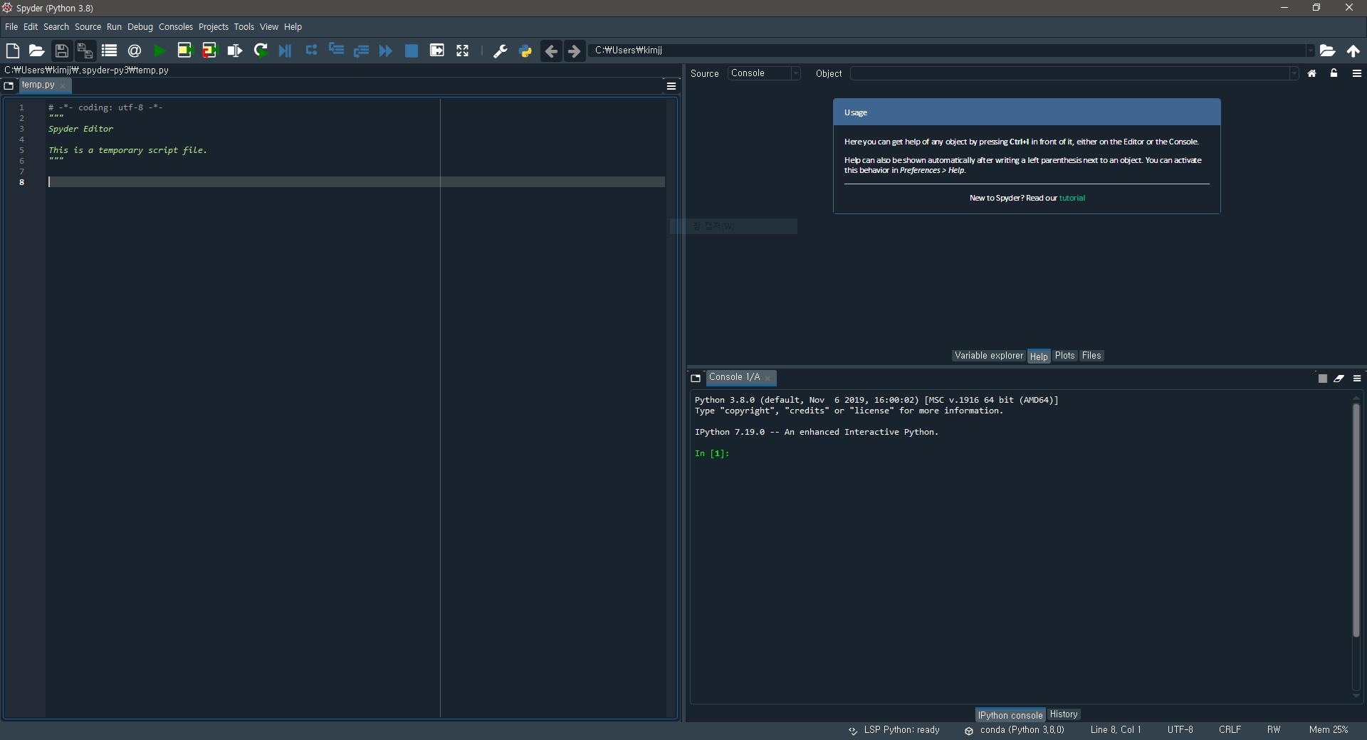 이제 코딩을 시작할 차례입니다. 저는 spyder IDE을 주로 사용하고 있습니다. spyder 설치는 콘다에서 지원하는 conda명령어로 설치해줍니다. 의존성 설치 파일이 조금 많다 보니 약간의 시간이 소요됩니다. 모든 설치가 완료되면 이제 간단하게 spyder 명령어를 통해 IDE를 불러올 수 있습니다.