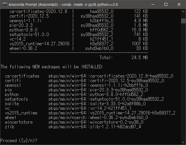 원하는 파이썬 버전에 맞는 가상 환경 생성 명령어입니다. 보통 파이썬 3.8을 기준으로 생성하게되면 저는 가상환경 이름은 py38 정도로 나중에 찾기 쉽게 이름을 짓습니다. 명령어를 실행하면 기타 필수 패키지 설치 문구가 나옵니다. y + 엔터를 입력해 가상환경을 생성해줍니다.