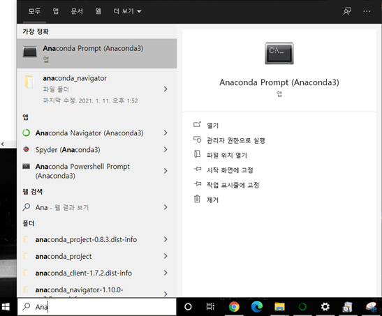 설치가 완료되면 탐색 창을 열어 Anaconda Prompt (Anaconda3)를 실행해봅니다.