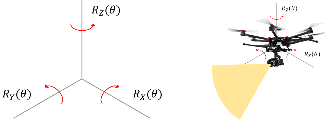 - Z축 회전 $R_{Z}(\theta) =$ \begin{bmatrix} \cos\theta & -\sin\theta & 0 \\ \sin\theta & \cos\theta & 0 \\ 0 & 0 & 1 \end{bmatrix}