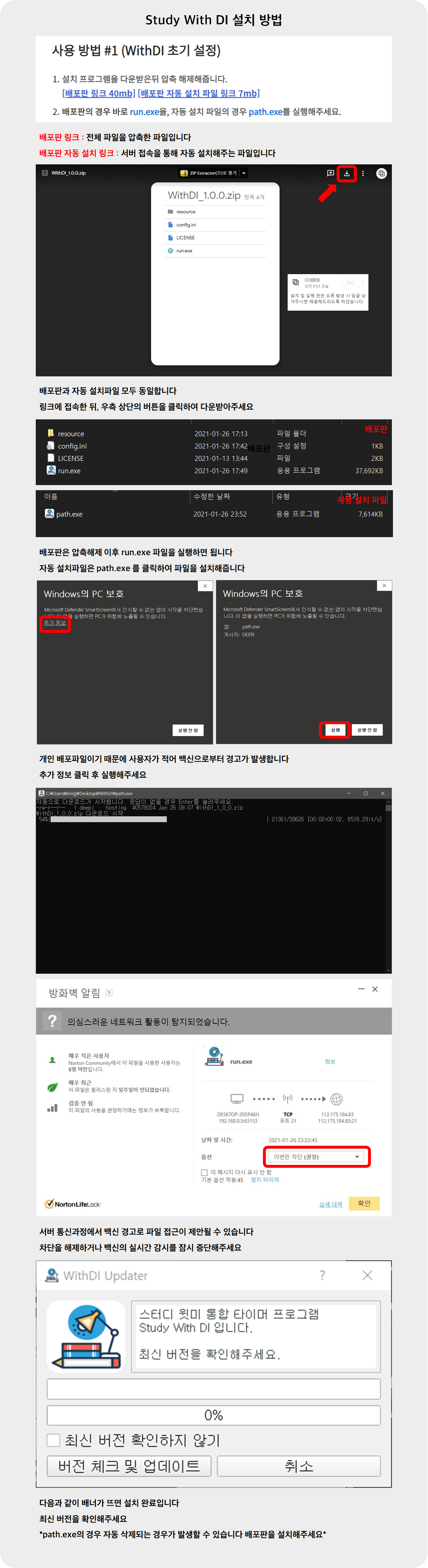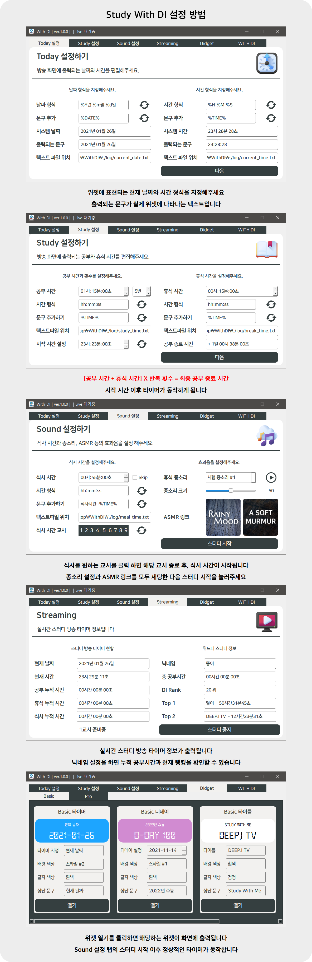 With DI ver - 1.0.0 스터디윗미 방송이나 PC 환경에서 공부하시는 분들을 위한 타이머 프로그램 위드디(with DI)입니다. 가끔 유튜브에서 코딩 방송하고 있는데 좀 더 저에게 필요한 기능만 구성하고