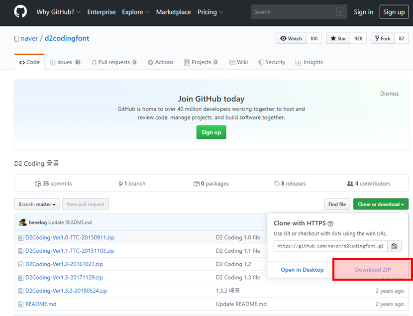https://github.com/naver/d2codingfont에서 접속한 후 [Downloads ZIP]을 클릭하여 다운로드합니다.