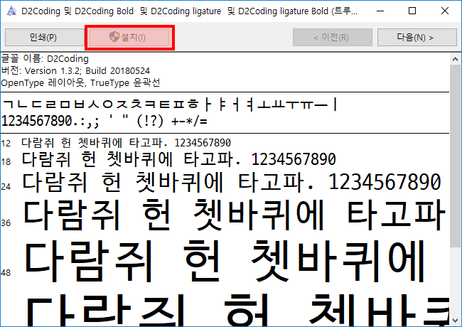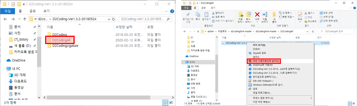 D2 CodingAl l폴더에 접근한 후 폰트 파일을 우클릭하여 [모든 사용자용으로 설치]를 클릭합니다.