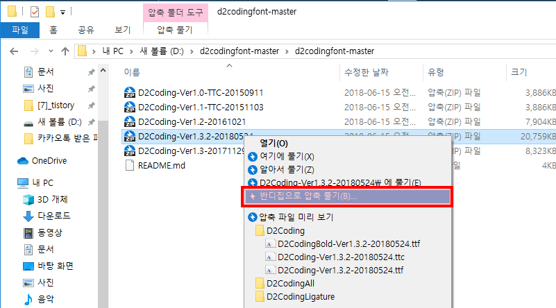 다운로드한 파일의 압축을 해제한 다음에는 다운로드 위치에 접근하여 가장 최신 버전의 폰트의 압축을 해제합니다.