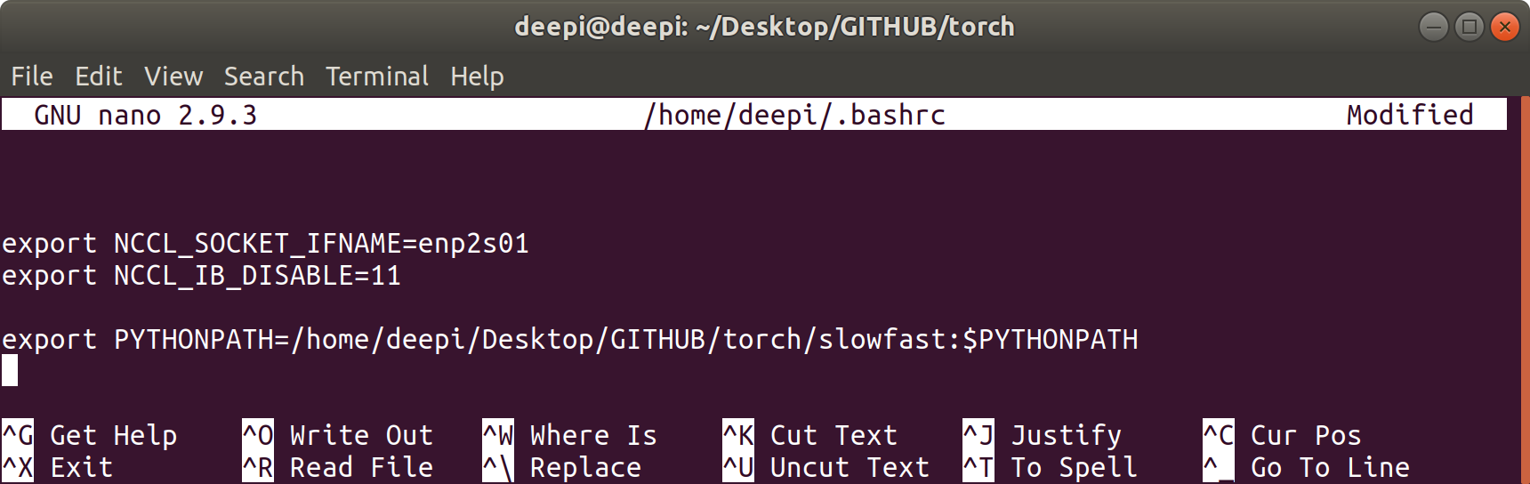 필수 패키지가 모두 설치되었다면, slowfast를 깃허브 링크를 통해 clone 해줍니다. 완료되면 slowfast 폴더를 파이썬 환경변수로 지정해야 합니다. nano 에디터에서 bashrc를 실행해주세요.