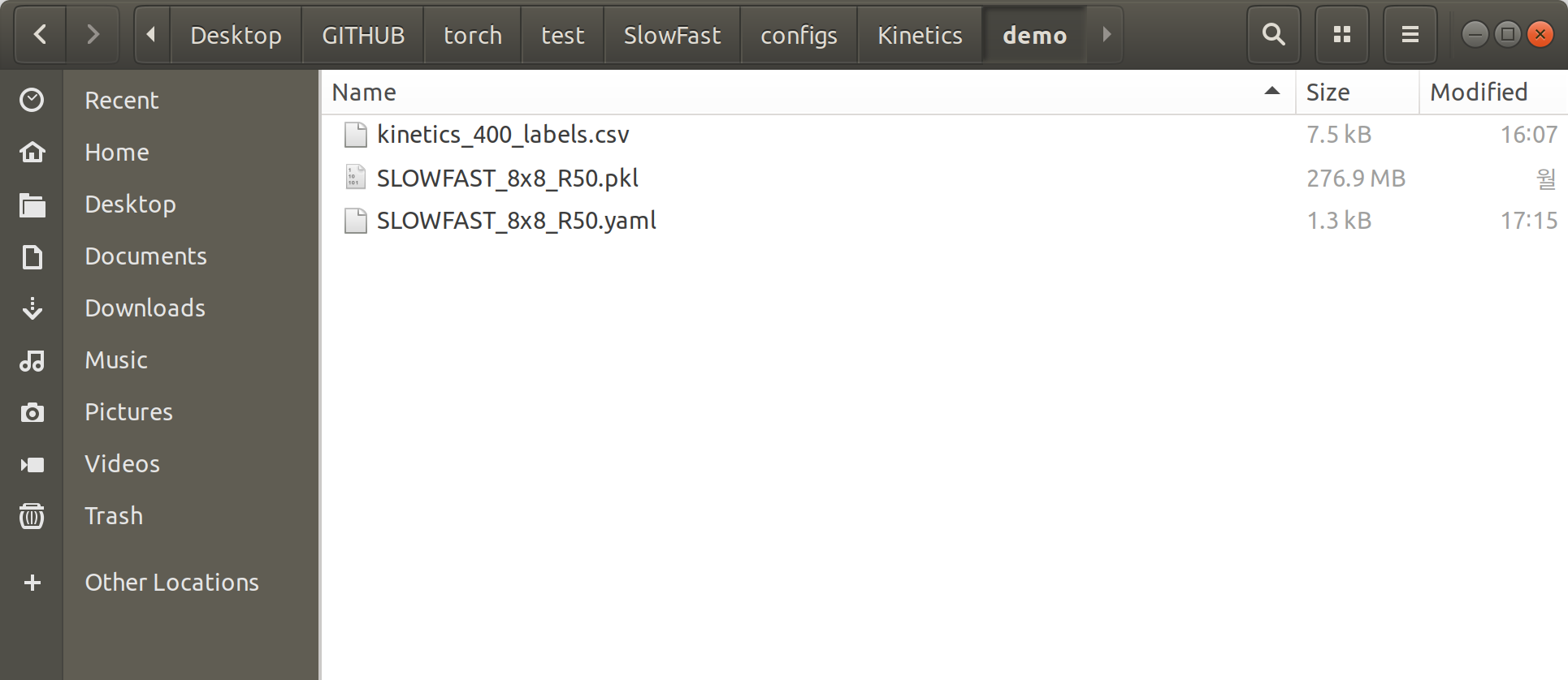 새롭게 받은 SlowFast 폴더 내 configs/Kinetics/demo의 경로에 다운로드한 가중치 파일을 옮겨줍니다. 실행을 위해서는 클래스 라벨 파일. cvs, config 파일. yaml, 가중치 파일. pkl 이 필요합니다.